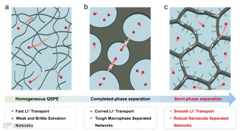 图1. (a)均质聚合物电解质、(b)相分离聚合物电解质与(c)半相分离聚合物电解质的结构设计及特征对比