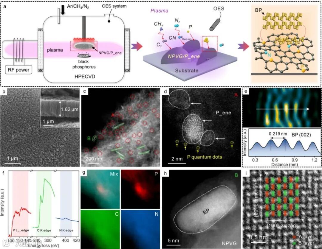 图1. (a) HPECVD法制备NPVG/P_ene的示意图;(b) SEM图像;(c) HAADF-STEM图像显示P_ene纳米岛(红色圈)和BP纳米带(绿色圈);(d) 原子级HAADF-STEM显示P_ene及磷量子点;(e) 反FFT图及晶格间距;(f) EELS谱;(g) EELS元素面分布;(h,i) BP的高分辨图像及原子结构。