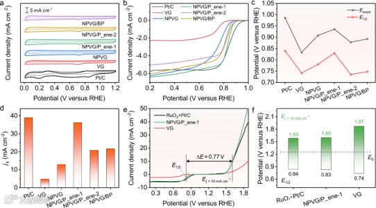 图3. (a) CV曲线;(b) ORR LSV曲线;(c,d) 半波电位、起始电位和动力学电流密度对比;(e) ORR和OER综合LSV;(f) 双功能电位差对比。