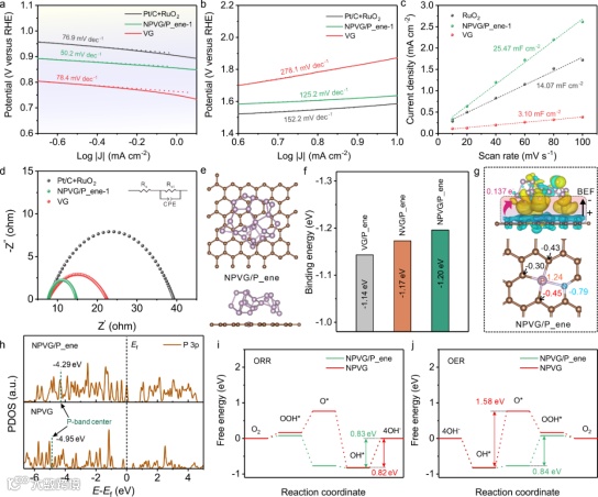 图4. (a,b) ORR和OER Tafel曲线;(c) 双电层电容;(d) Nyquist图;(e) NPVG/P_ene优化结构;(f) 异质结结合能;(g) 差分电荷密度及Bader电荷;(h) PDOS;(i,j) ORR和OER自由能图。