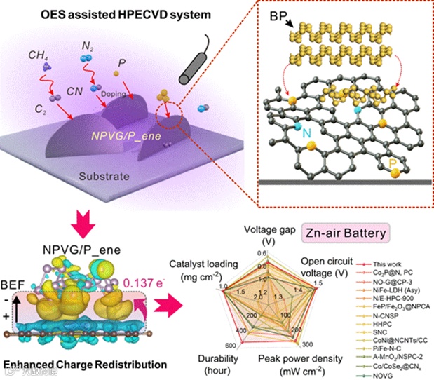 图1. HPECVD原位构建NPVG/P_ene纳米异质结电催化剂实现高性能锌-空气电池。