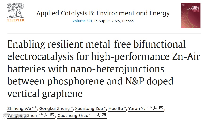 近日,郑州大学邵国胜教授课题组在Applied Catalysis B: Environment and Energy上发表了题为“Enabling Resilient Metal-Free Bifunctional Electrocatalysis for High-Performance Zn-Air Batteries with Nano-heterojunctions between Phosphorene and N&P Doped Vertical Graphene”的研究论文(DOI: 10.1016/j.apcatb.2026.126665)。该工作通过一步法构筑N&P共掺杂垂直石墨烯片与纳米/亚纳米磷烯间的纳米异质结,实现了催化位点电荷分布的协同调控,从而同时降低ORR与OER能垒,赋予材料优异的循环稳定性、高开路电压及高峰值功率密度,性能大幅超越贵金属基催化剂。