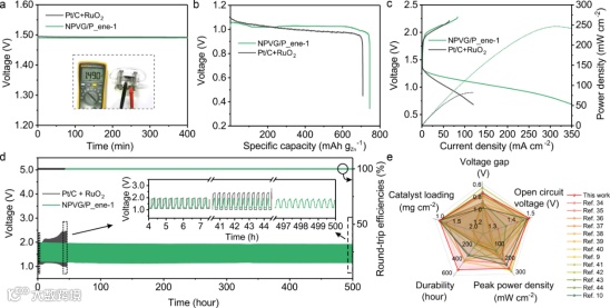 图5. 锌空气电池应用。(a) 开路电压;(b) 恒流放电曲线;(c) 极化曲线与功率密度;(d) 长循环稳定性;(e) 性能雷达图与文献对比。