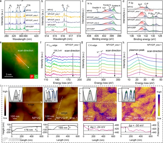 图2. (a,b) 不同样品的OES谱;(c,d) XPS N 1s和P 2p谱;(e) EELS元素面分布;(f-h) 线扫EELS谱显示P L2,3边、C K边和等离子峰;(i) AFM和KPFM表面电位图。