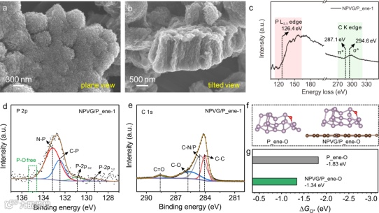 长循环后SEM显示垂直石墨烯形貌保持完好,无坍塌团聚。EELS显示P L2,3边仅偏移0.2 eV,表明P_ene化学环境基本不变。XPS中P 2p峰位无偏移,C 1s出现更多含氧官能团,说明碳基底表面氧化但P_ene稳定。DFT计算表明,O原子在NPVG/P_ene上的吸附能(-1.34 eV)比在纯P_ene上(-1.83 eV)低0.49 eV,即异质结中P_ene更难被氧化。这归因于NPVG向P_ene的电荷转移使P原子富电子化,抗氧化能力增强。