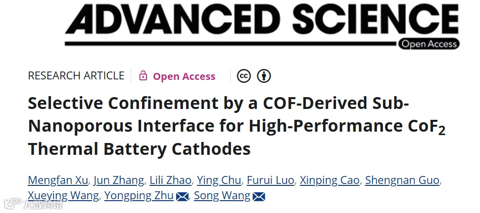 近日,来自中国科学院过程工程研究所的朱永平研究员和王崧研究员团队在国际知名期刊Advanced Science上发表题为"Selective Confinement by a COF-Derived Sub-Nanoporous Interface for High-Performance CoF2 Thermal Battery Cathodes"的研究论文。该工作提出了一种基于离子筛分概念的选择性限域策略,通过原位构筑亚纳米多孔碳界面,有效抑制了正极材料的溶解与穿梭效应,有助于热电池性能实现突破性提升。