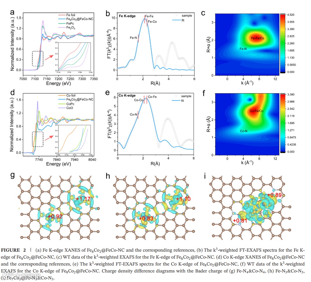 利用同步辐射X射线吸收精细结构谱(XANES/EXAFS)系统揭示了Fe₇Co₃@Fe-N₃&Co-N₃的原子级配位结构,进一步验证了金属-氮配位(Fe-N3、Co-N3)和金属-金属键的共存。同时Fe7Co3合金严重破坏了Fe/Co-N4部分的整体电荷对称性,Bader电荷分析显示Fe₇Co₃@Fe-N₃&Co-N₃中Fe/Co位点的电子转移量(0.89/0.81)显著低于Fe-N₄&Co-N₄中Fe/Co位点的电子转移量,证明Fe₇Co₃合金作为电子库向Fe/Co-N3活性位点提供额外电子。而且,Fe/Co-N3和Fe7Co3合金之间积累了更多的电荷,导致Fe7Co3的边缘呈现富电子化。