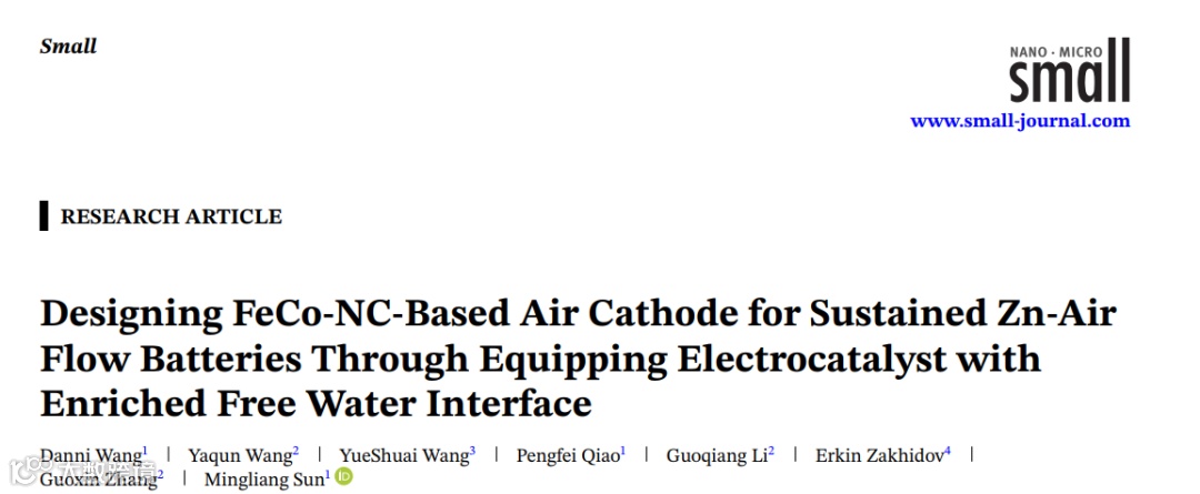 近日,中国海洋大学孙明亮教授与山东科技大学张国新教授合作,在知名期刊Small上发表“Designing FeCo-NC-Based Air Cathode for Sustained Zn-Air Flow Batteries Through Equipping Electrocatalyst with Enriched Free Water Interface”的观点文章,该文章通过向廉价的Fe-NC催化剂引入Co物种,精心构建了Fe₇Co₃@Fe-N₃&Co-N₃基空气阴极(Fe₈Co₂@FeCo-NC样品)。通过从头算分子动力学(AIMD)和原位拉曼光谱验证,由于催化剂结构中配置Fe7Co3合金电子库成功地实现了对空气电极表面界面水的操控,更多地自由水富集在表面。因此,活性中间体的吸附-解吸-转移过程更快、更有效,不受刚性氢键网络的限制。Fe₈Co₂@FeCo-NC电催化剂表现出优异的双功能催化活性和反应动力学,锌空气电池(ZnAB)功率密度达208 mW cm⁻²。组装的锌空液流电池(ZnAFB)实现了高达56 mAh cm⁻²的放电面容量,并在28 mAh cm⁻²放电容量下实现了469小时的不间断运行寿命。