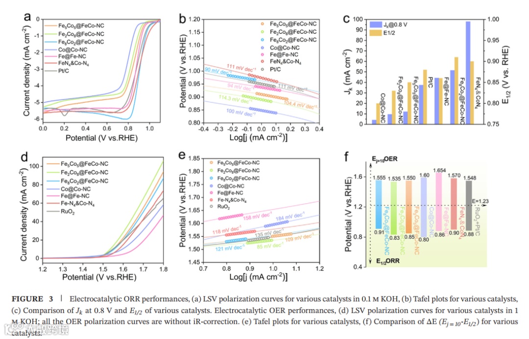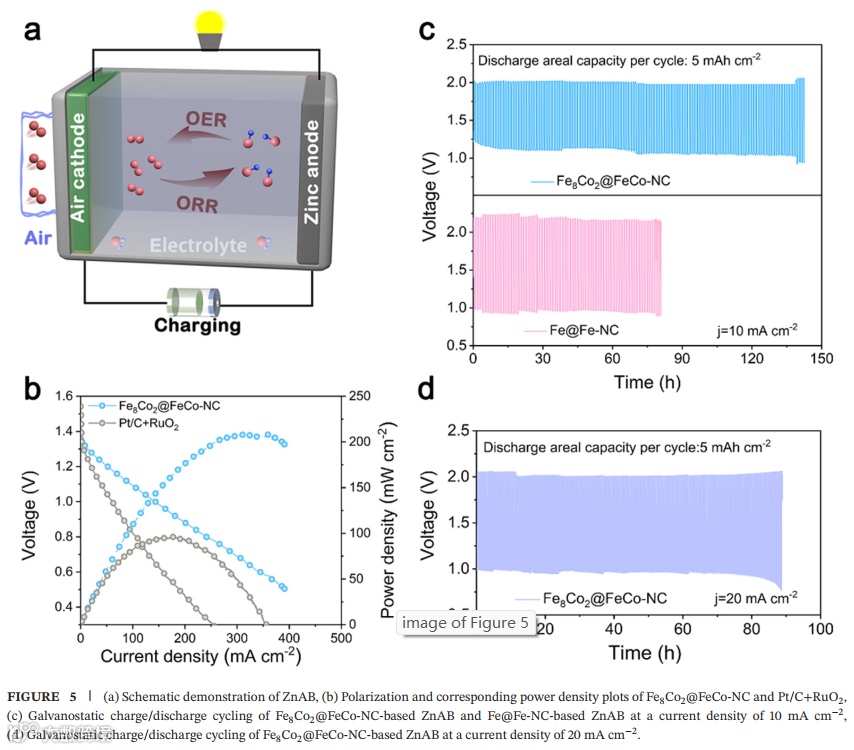 Fe₈Co₂@FeCo-NC催化剂展现出卓越的双功能ORR/OER活性:在0.1 M KOH中半波电位为0.91V,在1 M KOH中10 mA cm⁻²时过电位为325 mV,ΔE值为0.645 V,优于其他对比样品和商业Pt/C+RuO₂催化剂,预示着其在ZnAB和ZnAFBs中具有巨大的应用潜力。
