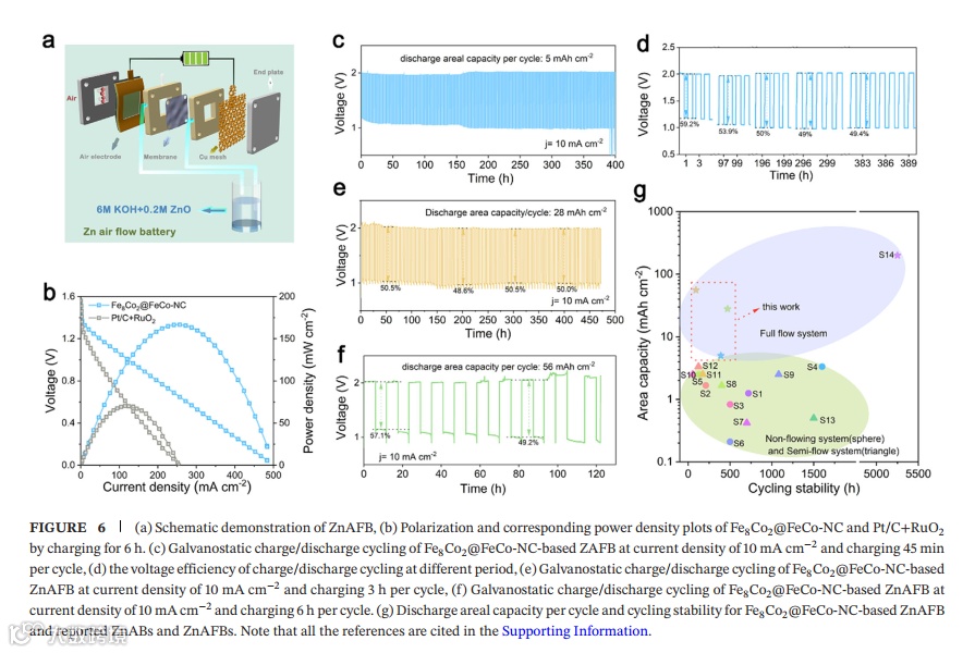 随着全球能源转型的加速,储能技术是解决可再生风能和太阳能间歇性问题的主要力量。目前,传统锂离子电池占据市场主导,但同时面临着安全风险和资源限制相关的挑战。然而氧化还原液流电池具有容量和功率解耦,安全、超长寿命(如果是水基的)和灵活的可扩展性等特点,已成为大规模储能的有力竞争者。基于可充电锌空气电池(ZnAB)技术的锌空气液流电池(ZnAFB)因其高理论能量密度(≈1370 Wh kg−1)、低成本(丰富的锌储量,比锂便宜20倍)、操作安全性(水性电解质和稳定的锌阳极)和优异的环保性(无毒材料)而越来越受到关注。然而,锌空液流电池面同时临着放电面容量低(通常1-2 mAh cm⁻²)和高面容量测试条件下循环寿命短等限制。电池性能的进一步提升直接受限于空气电极阴极催化剂的催化活性和空气电极的结构设计。传统Fe-NC催化剂具有优异的ORR活性,但OER活性位点不足,不可避免地会影响锌空或锌空液流电池往返性能。此外,电极表面的电化学双层(EDL)氢键网络在碱性电解质中倾向于形成刚性的冰状界面水层,这将影响*OH的解吸和转移,以及随后在活性位点上*OOH形成和吸附,严重影响OER活性以及锌空液流电池的性能。