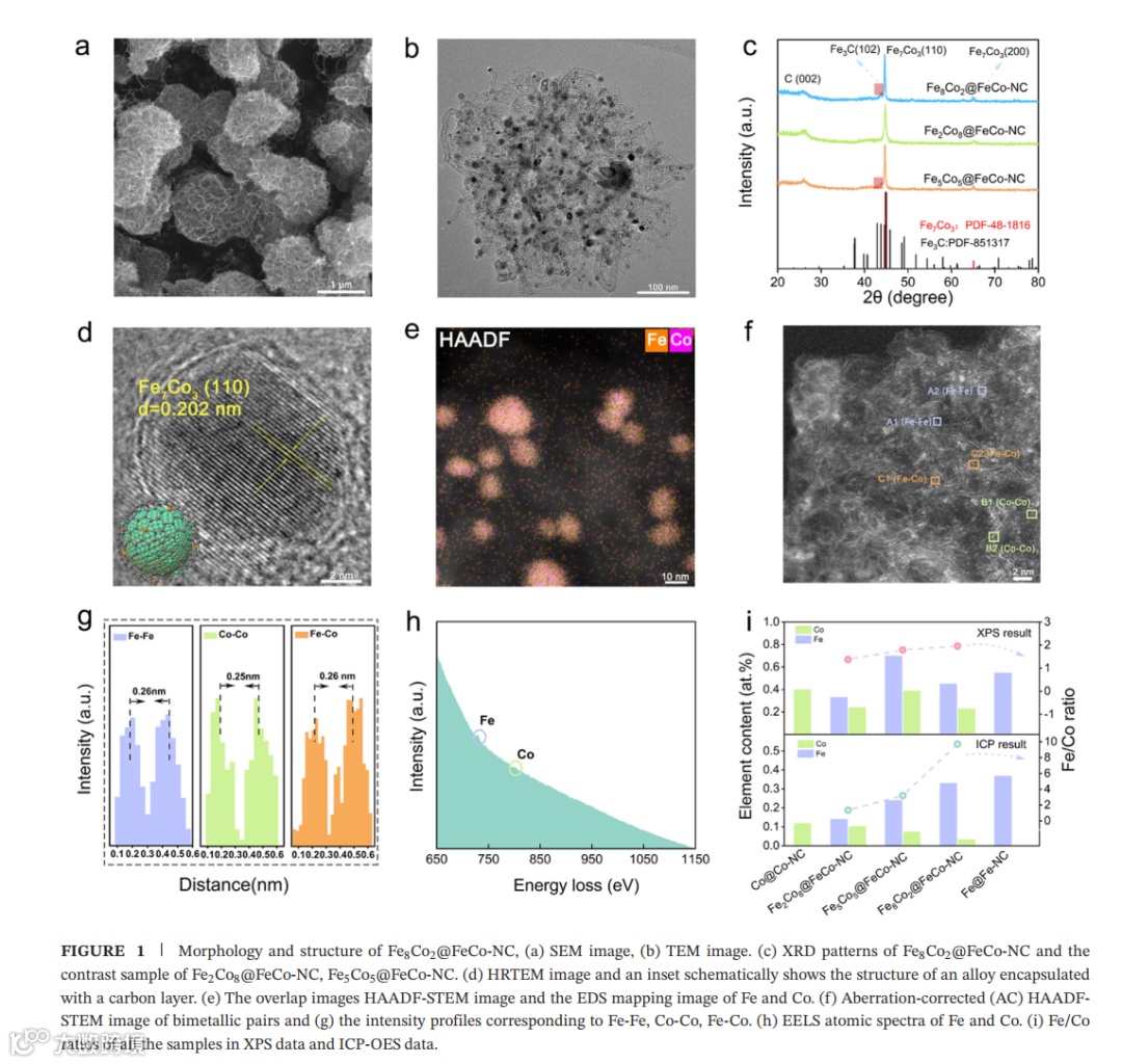 设计合成了Fe/Co比值可调的FenCo10-n@FeCo-NC (n = 2, 5, 8)催化体系,主样品Fe₈Co₂@FeCo-NC的主体结构是Fe₇Co₃@Fe-N₃&Co-N₃,其中以Fe7Co3纳米颗粒为核结构,被含有丰富的Fe-N3、Co-N3位点的FeCo-NC壳封装。而且催化剂表面和本体结构具有不同Fe/Co比值,表明催化剂表面和本体具有不同的活性位点。