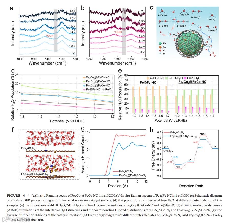 通过原位拉曼光谱监测OER活性中间体*OOH吸收峰在不同施加电位下的变化证实了FenCo10-n@FeCo-NC (n = 2, 5, 8)样品能快速产生*OOH。同时讨论了FenCo10-n@FeCo-NC和对比样品表面界面水结构以及演变过程来阐述OER活性提高的根源。研究表明,除RuO2之外,不同样品中界面自由水的比例与OER性能趋势几乎保持一致,催化剂表面自由水的富集对提高催化性能做出了重大贡献。进一步对界面水结构和相应氢键分布进行了AIMD模拟。通常,界面自由水的氧原子因其强电负性而带轻微的负电荷,氢原子带正电荷。因此,AIMD模拟结果发现在Fe7Co3@Fe-N3&Co-N3表面上由于Fe7Co3的富电子边缘,其吸附为H-down形式,相应的水分子的平均氢键数也显著减少。但是,界面水在Fe-N4&Co-N4表面上的吸附依然为O-down形式。平均氢键数的减少削弱了界面水氢键网络的有序程度,从而促进了*OH的解吸和转移,同时增加了界面自由水的比例。此外,密度泛函理论(DFT)计算进一步用于阐明OER过程的内在机制。在U=1.23 V时的吉布斯自由能(G)表明,Fe7Co3@Fe-N3&Co-N3在Co-N3位点上的*OH吸附值较低。这意味着重构的氢键网络更有利于*OH的解吸和转移,这是决速步骤中*OOH快速形成的先决条件。与此同时,Fe-N4&Co-N4和Fe7Co3@FeN3&Co-N3的相应过电位分别为0.50和0.41 V,揭示了Co-N3位点OER活性显著增强的关键,源于Fe7Co3合金提供额外电子对*OOH的吸附增强。因此,Fe7Co3作为辅助活性位点通过调节Co-N3位点的电子和界面水环境,协同促进了Co-N3活性位点OER活性。