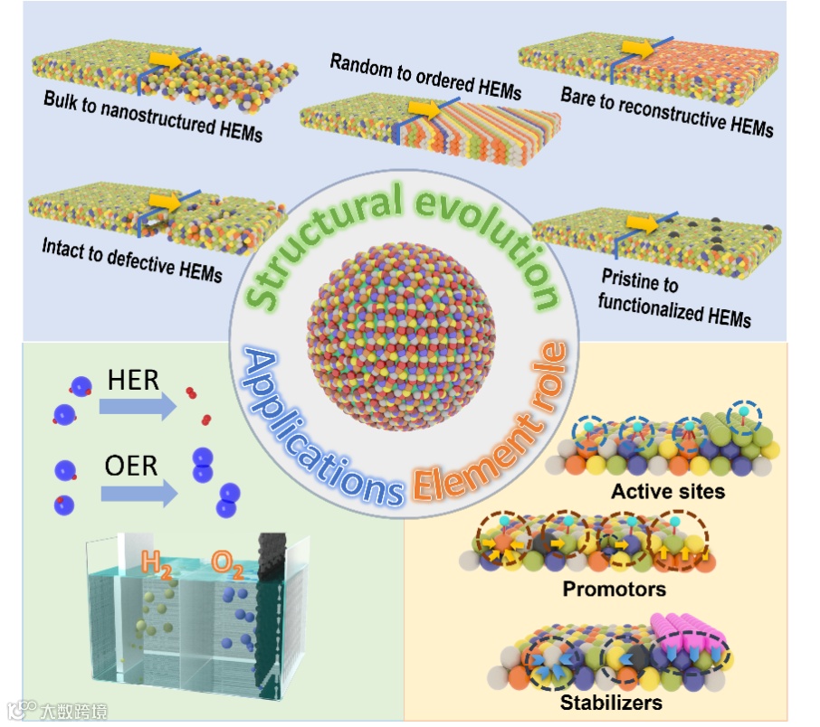 悉尼科技大学汪国秀院士,刘浩教授、张晋强研究员,江苏师范大学黄鹏教授等人近日总结了高熵材料的发展过程,追溯了其通过原子纳米工程策略(即从块体到纳米结构,从随机分布到相对有序的架构,从原始HEMs到重构HEMs,从完整的HEMs到有缺陷的结构,从原始HEMs到功能化变体)的出现和结构演变,并揭示了这些演变步骤如何有助于HEMs的性能并增强其在水分解中的催化性能。探讨了各个元素(例如活性位点、促进剂、稳定剂)在塑造高熵材料的结构、稳定性和催化活性中的基本作用,为合理设计高效的基于高熵材料的电催化剂奠定了基础。该综述还强调了高熵材料基水解催化剂的最新进展,重点介绍了理想的属性和元素贡献。最后,讨论了高熵材料在能源转换技术中面临的挑战和未来发展方向。