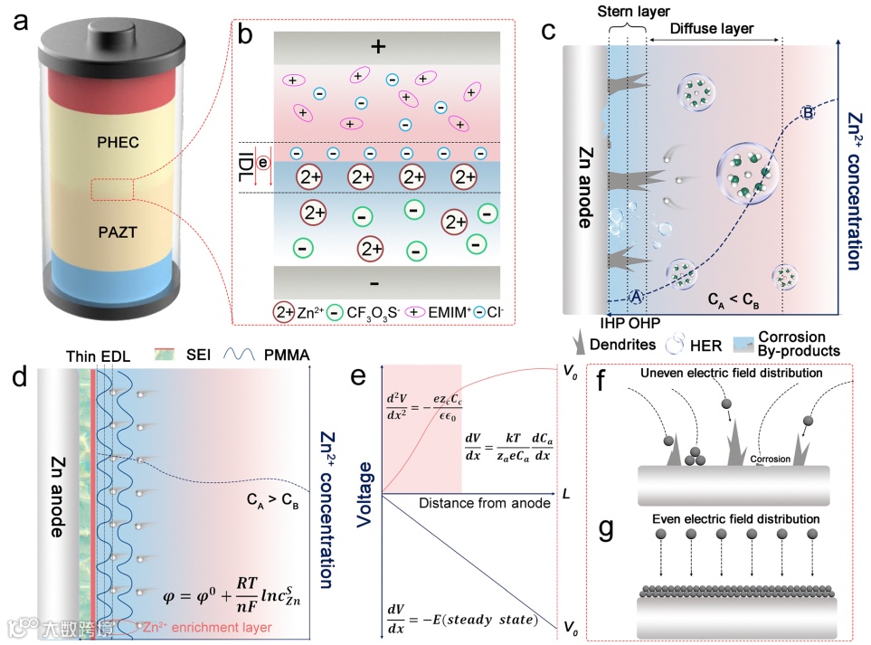 准固态或固态电解质有望解决锌电池中长期存在的挑战,如锌枝晶形成和不可避免的副反应。北京化工大学陈仕谋(国家杰青)团队与悉尼科技大学汪国秀院士、陈勇等在Energy & Environmental Science期刊发表题为“A Janus-Type Quasi-Solid-State Electrolyte Enabling Dual-Ion Relay for Long Lifespan of Nonaqueous Zinc Batteries”的研究论文,团队成员赵顺顺为论文第一作者,悉尼科技大学陈勇、陈仕谋为论文共同通讯作者。该研究报道了一种无水Janus准固态电解质,通过双离子接力机制实现了锌电池优异的长期循环性能。PVDF-HFP与PMMA聚合物层之间自发形成的内置电场诱导产生离子双层(IDL),有效解决了低盐浓度条件下固态无水体系离子传输动力学的固有局限性。得益于电解质构建的IDL及衍生的有机外层-无机内层梯度SEI,实现了有效的离子整流和传输。因此,Zn||Zn对称电池表现出高度可逆的Zn²⁺沉积/剥离且无枝晶生长,在25°C下循环寿命超过13,300小时,在60°C下超过3,000小时。采用聚苯胺阴极的全电池表现出卓越的稳定性(>10,000次循环)和从25°C至80°C的可靠运行。
