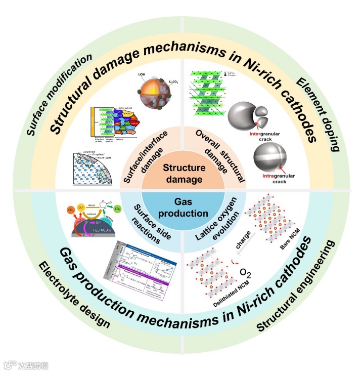 电动汽车产业的迅猛发展,对锂离子电池的性能提出了前所未有的要求:更高的能量密度、更长的循环寿命以及绝对的安全保障。在此背景下,富镍层状氧化物正极材料因其高理论容量和较低的成本脱颖而出,被视为实现动力电池能量密度突破的关键。然而,“高镍”如同一把双刃剑,在提升容量的同时,也急剧放大了材料固有的不稳定性,主要表现为严重的结构衰退和剧烈的产气行为。聚焦于富镍层状正极的结构稳定性与气体释放行为,四川大学尧猛,悉尼科技大学汪国秀、陈勇,北京林业大学姜帅成等人详细分析了其结构损伤机制、产气机理及改性研究进展。首先,作者系统总结了各类结构损伤的成因、过程及影响,包括富镍正极表面/界面发生的化学成分变化与晶格结构转变,以及贯穿材料整体的微裂纹和阳离子混排问题。随后,文章详细阐述了富镍正极气体释放的多重机理,涵盖残余锂化合物的分解、电解质的氧化分解、晶格氧的释放以及气体逸出所引发的后续效应。最后,该综述基于失效机理,系统总结了抑制富镍正极结构损伤与气体释放行为的策略。通过表面改性、元素掺杂、电解质设计和结构工程等手段,可有效提升电池的安全性与循环寿命。通过理解富镍正极各失效机制间的相互耦合关系,研究者能够采用更丰富且更具针对性的改性策略,从而为富镍正极材料的商业化应用提供科学依据与技术支撑。