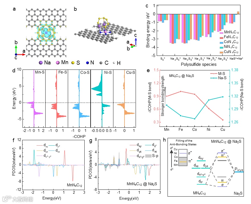 室温钠硫(RT Na‒S)电池因钠资源丰富、理论能量密度高(1274 Wh・kg−1)成为储能领域的研究热点,但面临多硫化物(Na2Sn,4≤n≤8)溶解导致的活性物质流失、界面降解及容量快速衰减等问题。悉尼科技大学汪国秀院士团队联合上海理工大学王云晓教授和温州大学谭歆教授聚焦RT Na‒S电池面临的多硫化物穿梭和动力学迟缓问题,提出以过渡金属单原子催化剂(SACs)通过p‒d轨道杂化提升性能的解决方案。研究通过密度泛函理论计算筛选出Mn、Fe、Co等过渡金属形成的MN4结构,发现MnN4对多硫化物吸附能力最强(结合能−3至−5 eV),且催化动力学最优。采用空间限域法合成了原子级分散的M‒N‒C SACs。原位XRD和非原位 XAS证实了Mn通过p‒d轨道杂化(3d5半满构型与硫p轨道形成σ/π键)加速长链多硫化物转化为短链产物,抑制穿梭效应,且Mn价态在充放电中可逆变化,保证结构稳定。该研究建立了电子结构与性能的关联,为金属硫电池催化剂设计提供普适策略,Mn‒N‒C的低成本和易规模化特性具实际应用潜力。