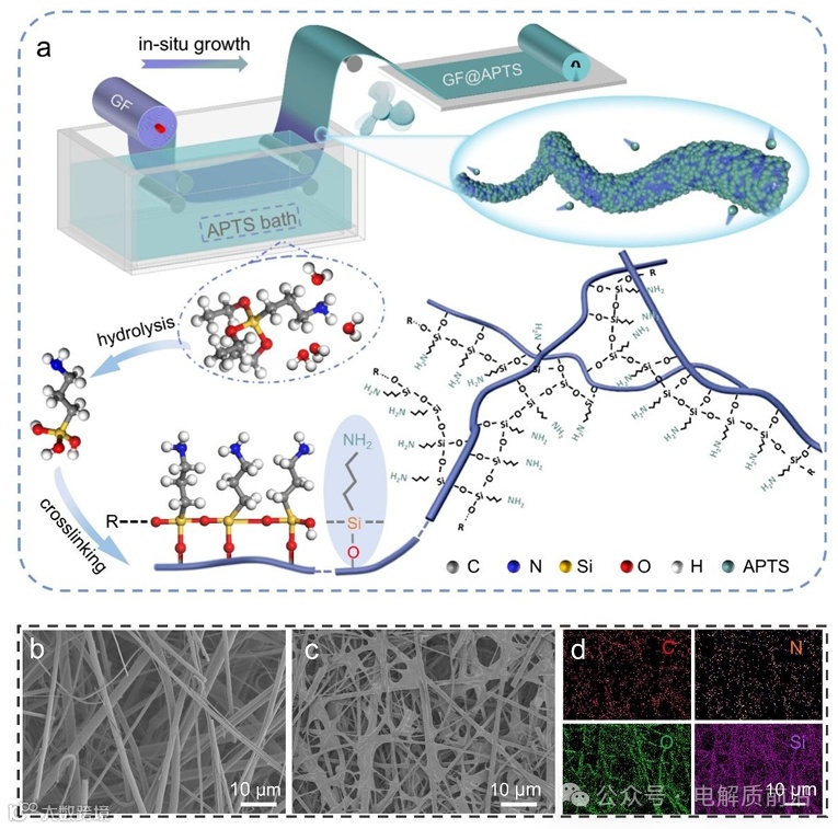 水系锌离子电池中普遍使用的玻璃纤维隔膜对界面反应的控制不足,导致锌枝晶的快速生长和寄生反应的加剧。此外,锌离子电池在极端操作条件下的稳定性仍然是一个关键但经常被忽视的问题。基于此,悉尼科技大学汪国秀院士和江南大学翟胜利提出了一种新型的硅烷修饰玻璃纤维隔膜,其具有工程物理结构和表面化学性质,有助于实现高度可逆和超可靠的锌离子电池。硅烷增强隔膜,抵抗应力,并在火焰下形成隔热炭层,确保在极端条件下的可靠性。硅烷网络还可以作为填料,增强孔的均匀性,使Zn2+通量均匀。硅烷中的氨基展示了界面阴离子、阳离子、水转移和反应动力学的综合管理。这种能力诱导Zn2+在界面上富集,加速Zn2+的转移,减少沉积障碍,并阻止水分子和硫酸根离子参与寄生反应。因此,在250次循环中,实现了99.4%的库仑效率的无枝晶镀锌/剥离,7000小时的稳定充放电性能,以及Zn//V全电池的出色循环稳定性和阻燃性。该策略展示了各种隔膜材料和电池化学的多功能性,为更可靠、性能更高的储能系统提供了一条有前景的途径。