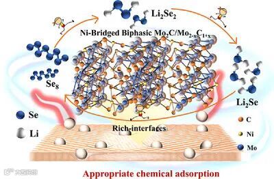 近年来,锂–硒(Li–Se)电池因其较高体积能量密度与良好导电性受到关注,但在高倍率与长循环条件下往往受限于Se/Li2Sex的反应动力学迟缓以及放电产物累积导致的电极钝化。针对这一瓶颈,澳大利亚悉尼科技大学刘浩/汪国秀团队联合上海大学和江苏师范大学共同报道了一种Ni桥联的双相碳化钼(Mo2C)多界面催化结构,通过“催化+导电”功能协同,在电极中暴露丰富活性位点并显著提升高电流操作下的电化学可逆性。该设计中,Ni既作为结构桥梁连接Mo2C晶格,又通过调控Mo的d轨道电子构型以最大化功能化Mo2C的催化效率;由此产生的吸附/脱附/催化协同效应,不仅加速长链Li2Sex物种的沉积与转化,还促进Li2Se2→Li2Se的关键固–固转化,实现Li–Se体系的“全流程催化转化”。得益于这一快速固–固转化通道,即使在较高硒载量5.6 mg cm−2条件下,电极仍可在0.1 C下提供约400 mAh g−1的初始容量,并表现出优异的循环稳定性与倍率性能,为高性能Li–Se电池正极催化界面工程提供了新的设计思路。