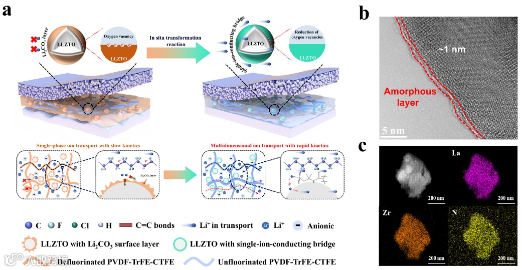 基于复合聚合物电解质(CPE)的锂金属电池已成为下一代电池最有前景的候选者。然而,复合相之间的内在不相容性严重损害了电解质性能。基于此,北京化工大学陈仕谋&悉尼科技大学汪国秀提出了一种内置的单离子导体桥,将石榴石型氧化物相与PVDF基聚合物该研究通过巧妙构建内置单离子导电聚合物桥,有效解决了 CPE 中无机填料与聚合物基质之间的相容性问题,显著提升了电解质的离子传输性能和界面稳定性。所制备的 CPE 在室温下展现出高达 5.20×10-⁴ S cm-¹ 的离子电导率和 0.73 的高锂离子传输数,搭载该电解质的锂对称电池在 -30℃下可稳定循环近 7000 小时。此外,这种 CPE 与多种正极材料具有良好的兼容性,在极端条件下(如 4.5 V 高电压、-30℃低温和 10.2 mg cm⁻²高载量)仍能保持稳定的循环性能,其组装的富镍锂离子袋式电池在 0.5C 倍率下实现了超过 1200 次的超长循环寿命。该策略在固态钠金属电池中也表现出色,钠对称电池循环寿命超过 1350 小时,搭载 NVP 正极的全电池在 1C 倍率下循环 2200 次后容量保持率接近 100%。综上所述,这项工作为高性能、高安全性固态锂 / 钠金属电池的实用化开辟了新的途径,有望推动新能源存储技术的发展。