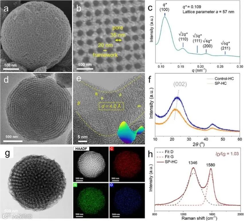 钠离子电池(SIBs)因钠资源储量丰富且成本低廉,成为一种前景广阔的储能技术。然而,其实际应用仍面临诸多挑战,包括初始循环期间的高不可逆容量损失、较差的倍率性能以及结构不稳定性。上海交通大学麦亦勇(国家杰青)、悉尼科技大学汪国秀院士团队合作在Advanced Materials期刊发表题为“Bicontinuous Structure Mediated Microstructural Engineering of Hard Carbon for Enhanced Sodium Storage”的研究论文,上海交通大学/悉尼科技大学汤臣为论文第一作者,麦亦勇、汪国秀院士、上海交通大学徐富贵、武汉理工大学安琴友为论文共同通讯作者。该研究通过微观结构工程,报道了一种具有单原始(SP)微观结构的双连续介孔硬碳材料(简称SP–HC),成功解决了这些局限性。这种SP–HC设计提高了Na⁺存储位点的密度和可及性,增强了碳材料的无序度,并扩大了层间距,从而提升了钠存储容量和动力学性能。其三维连续介孔通道可实现Na⁺的快速传输,在10 A g⁻¹电流密度下展现出172 mAh g⁻¹的卓越倍率性能(1分钟即可充满电)。值得注意的是,SP–HC负极表现出前所未有的循环稳定性,即使在10 A g⁻¹的高电流密度下循环100,000次后,仍能保持80 mAh g⁻¹的高容量。