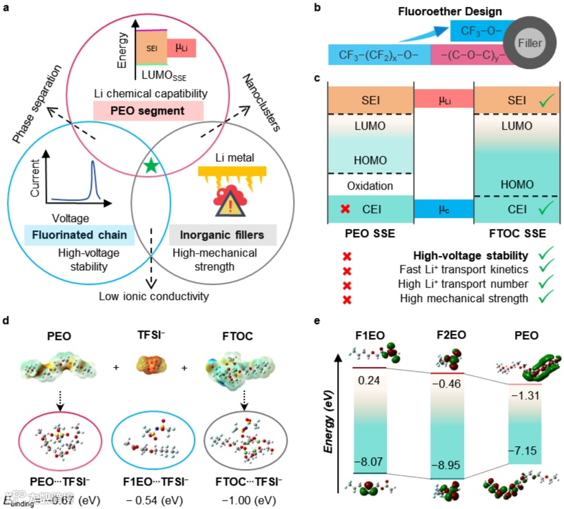 开发高压全固态锂金属电池(ASSLMBs)对下一代储能技术具有变革性潜力,但仍面临巨大挑战。传统聚环氧乙烷(PEO)基聚合物电解质因其玻璃化转变温度较低和优异的锂金属负极界面相容性而备受关注。然而,PEO聚合物链段在高压下易氧化分解,且其室温离子电导率仍不足以支撑全电池的高功率输出。此外,富镍NCM全电池中的PEO基电解质失效机理更为复杂,尤其是随机电压噪声和快速枝晶生长,严重限制了其在高压固态电池中的实际应用。面对这一瓶颈,复合电解质、高浓盐和氟化共混/共聚等传统策略虽可在一定程度上提升抗氧化性,但要构筑持久而稳固的电极/电解质界面,仍需深入探究高压正极、锂金属负极的界面化学,并开发兼具高离子传导与本征稳定性的全固态电解质体系。近日,澳大利亚悉尼科技大学汪国秀院士联手巴伊兰大学Doron Aurbach、北京化工大学陈仕谋教授首创性地将氟醚链段“植入”氧化物纳米复合相表面,并复合PEO基聚合物构筑出全新固态电解质(FTOC-SSE)。得益于氟醚柔性缓冲与纳米填料双重效应,该全固态电解质不仅展现卓越的高压抗氧化耐久性,而且实现了离子传输与界面稳定性的同步提升:Li//Li对称电池循环超9500h无短路,NCM811//Li全电池在4.5V高压下亦保持长寿命、高容量。该文章近期发表在国际顶级期刊Advanced Materials上。陈勇为本文第一作者。