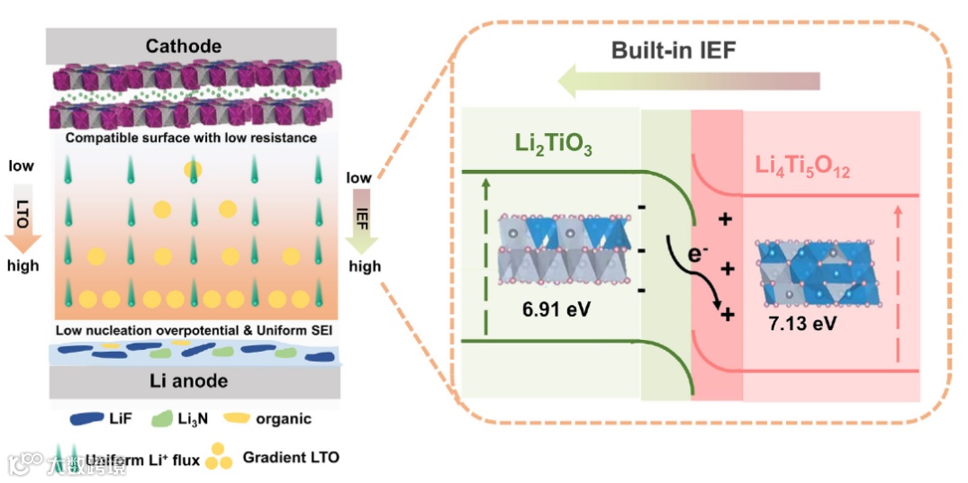 固态锂金属电池凭借其高能量密度与本质安全优势,已成为下一代储能技术的研发焦点。然而,聚合物电解质室温离子电导率低、锂金属负极枝晶生长难以抑制两大瓶颈,严重阻碍其实际应用。传统均质复合电解质难以在提升离子传导的同时,兼顾对电极界面的精准、稳定调控。四川大学尧猛副研究员、张云教授、悉尼科技大学汪国秀院士、陈勇博士等人在《Advanced Materials》上发表了题为“Gradient-Heterojunction in Solid Electrolytes for Fast-Charging Dendrite-Free Solid-State Lithium Metal Batteries”的研究论文。研究团队成功制备了一种名为PTLT-H的复合固体电解质,其核心在于将具有异质结结构的Li₂TiO₃/Li₄Ti₅O₁₂(LTO)纳米填料,通过直流电场诱导的定向组装技术,在聚合物基体(PVDF-TrFE)中构筑出连续的浓度梯度分布。通过晶格失配形成的异质结产生了一个内置电场(IEF),该电场促进了锂盐的解离并形成了连续离子传导路径,从而将室温下的离子电导率提升至0.83 mS cm⁻¹。此外,在外加电场作用下,带电LTO颗粒发生定向再分布,在靠近锂金属的一侧形成浓度更高的梯度结构。这种梯度IEF确保了Li-电解质界面均匀的Li⁺通量,同时增强的机械强度有效阻挡了枝晶延伸。因此,采用PTLT-H的对称Li||Li电池在1 mA cm⁻²(1 mAh cm⁻²)条件下表现出超过1000小时的稳定循环。此外,PTLT-H使固态电池具备了优异的长期性能,在5C倍率下循环5000次后容量保持率达到94.6%。该研究强调了梯度IEF工程是实现快充无枝晶固态电池兼具高电导率和界面稳定性的一种可行方法。