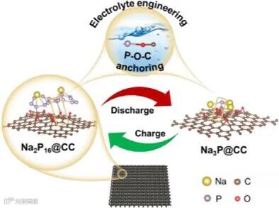 钠离子电池因其资源丰富、成本低廉及适用于大规模储能等优势,被视为锂离子电池的重要补充体系。然而,负极材料能量密度不足与循环稳定性有限,仍是制约其实际应用的关键瓶颈。磷基材料因具备高达2596 mAh g−1的超高理论比容量,被认为是极具潜力的钠离子电池负极候选,但其在充放电过程中往往经历复杂的多相转化反应,伴随剧烈体积膨胀及多聚磷化物的不可逆生成,导致反应动力学迟缓、可逆性差和容量快速衰减。针对这一核心瓶颈,由澳大利亚悉尼科技大学汪国秀教授、以色列巴伊兰大学Doron Aurbach教授和法国CIC energiGUNE的Michel Armand教授组成的国际合作团队提出了一种基于Na2P16↔Na3P的全新快速且可逆的电化学反应路径,突破了固态红磷体系中的动力学限制。通过构建Na2P16@CC复合结构,溶解态多聚磷化钠借助稳固的C–O–P化学键被有效固定于碳布基体上,其优异的可塑性显著缓解了钠化/脱钠过程中因体积变化引发的电极粉化。同时,富含氧官能团的碳布对磷物种的强化学吸附作用,以及弱溶剂化环状碳酸酯电解液的协同调控,有效抑制了高阶多聚磷化物在电解液中的溶解。得益于该反应机制的协同优化,Na2P16@CC负极在0.1 mA cm−2下实现了1.75 mAh cm−2的初始可逆面积容量,并在600次循环后仍保持81%的容量保持率,为高能量密度钠离子电池中磷基负极材料的理性设计提供了新的研究路径。