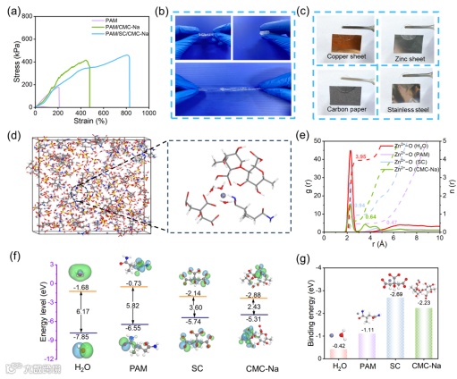 分子动力学模拟与DFT计算揭示了SC和CMC-Na对Zn2+溶剂化结构的调控机制。结果表明,两者能够优先与Zn2+发生配位,显著减少水分子在其第一溶剂化壳中的占比,从而构建新的溶剂化结构。