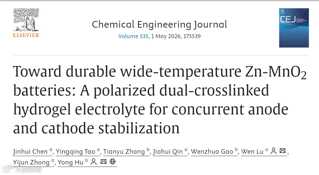 近日,来自浙江农林大学的胡勇教授与浙江师范大学的陆雯合作,在国际知名期刊 Chemical Engineering Journal 上发表题为 “Toward durable wide-temperature Zn–MnO2 batteries: A polarized dual-crosslinked hydrogel electrolyte for concurrent anode and cathode stabilization”的研究论文。该工作提出了一种极性双网络水凝胶电解质(PAM/SC/CMC-Na),通过协同重构电解质氢键网络、调控Zn2+溶剂化结构,并实现对锌负极与MnO2正极界面的同步稳定,从而在宽温范围内实现无枝晶、高稳定运行的水系Zn–MnO2电池。