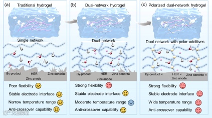 水系锌离子电池因其高安全性、环境友好性和低成本优势,被视为替代锂离子电池的潜在体系,但其应用仍受限于界面不稳定、温度适应性差及正负极耦合失效等问题。具体而言,锌负极易发生枝晶生长、析氢和腐蚀,导致循环寿命和库仑效率降低;而二氧化锰正极则面临锰溶解、结构退化及质子副反应,引发容量衰减。更重要的是,正负极间的相互干扰会进一步加剧体系失效。尽管传统水凝胶电解质可一定程度缓解界面问题,但其单一网络在极端温度下易冻结或脱水,且缺乏对双极界面的协同调控能力。因此,开发兼具宽温适应性与双极稳定性的电解质体系,对于实现高性能、长寿命水系锌电池至关重要。