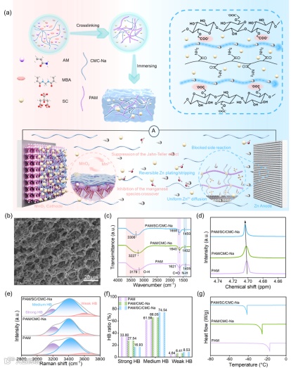 通过引入柠檬酸钠(SC)与羧甲基纤维素钠(CMC-Na),在PAM骨架中构建极性双网络结构,重构电解质中的氢键网络。该策略有效打破传统水–水强氢键作用,增加弱氢键比例,从而降低自由水活性,显著抑制析氢等副反应,并同时提升电解质的抗冻结与抗失水能力。