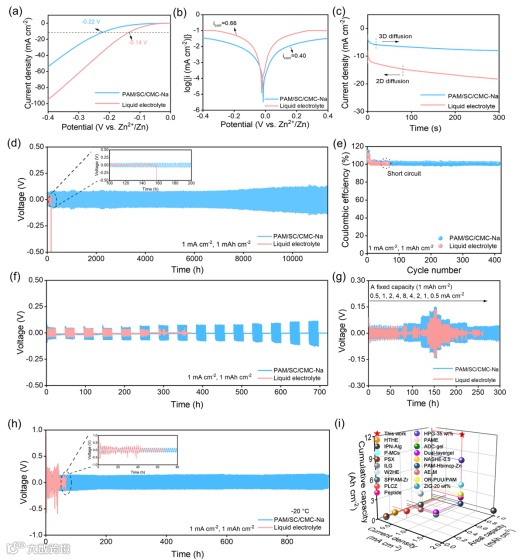 电化学表征系统验证了该水凝胶对锌负极的保护机制。结果表明,该电解质能够显著抑制析氢反应并提升抗腐蚀性能,促进Zn2+均匀沉积,从而有效抑制枝晶生长。得益于此,Zn//Zn对称电池在1 mA cm⁻2/1 mAh cm⁻2条件下实现了超过11430 h的超长循环寿命,并在–20 °C低温环境下仍可稳定运行937 h,展现出优异的环境适应性。