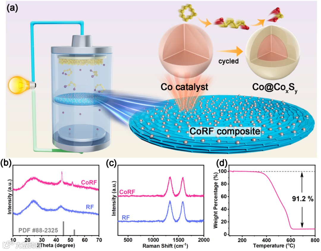 图1 CoRF的结构特征及其在电池过程中的表面硫化催化示意图
