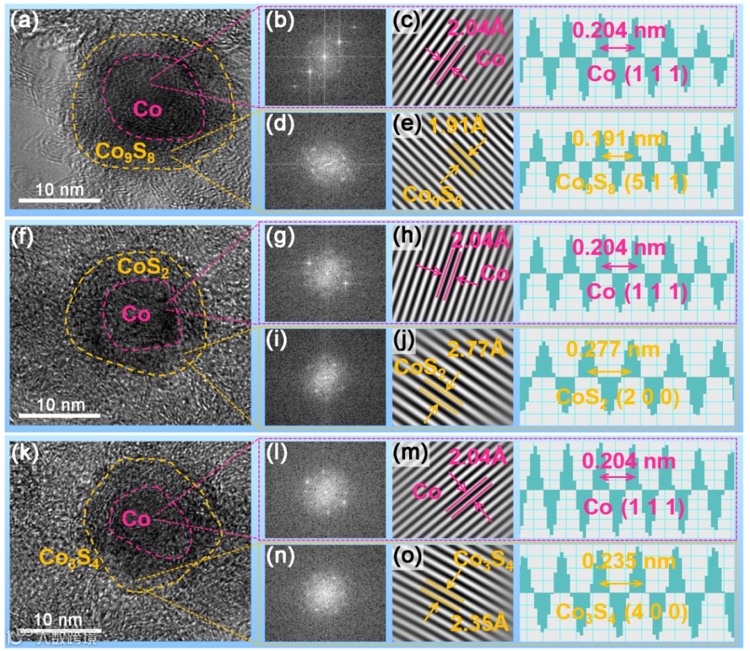 首次放电后的材料表征发现,Co纳米颗粒在电化学过程中发生显著表面转化,形成以金属钴纳米颗粒为核心、硫化钴(Co9S8、CoS2、Co3S4)为包覆层的异质结构。透射电子显微镜及傅里叶变换分析确认了Co纳米颗粒核心的晶体稳定性,同时验证了多相硫化钴的存在。X射线衍射及高分辨XPS谱进一步表明,Co表面在锂多硫化物作用下发生硫化反应,生成Co-S键,证实了电化学反应驱动的表面转化过程。此外,经放电后的CoRF表现出轻微提升的电化学活性面积(ECSA),表明部分硫化并未削弱活性位点的可及性。该Co@CoxSy异质结构不仅维持了催化活性,还增强了有效反应表面积。