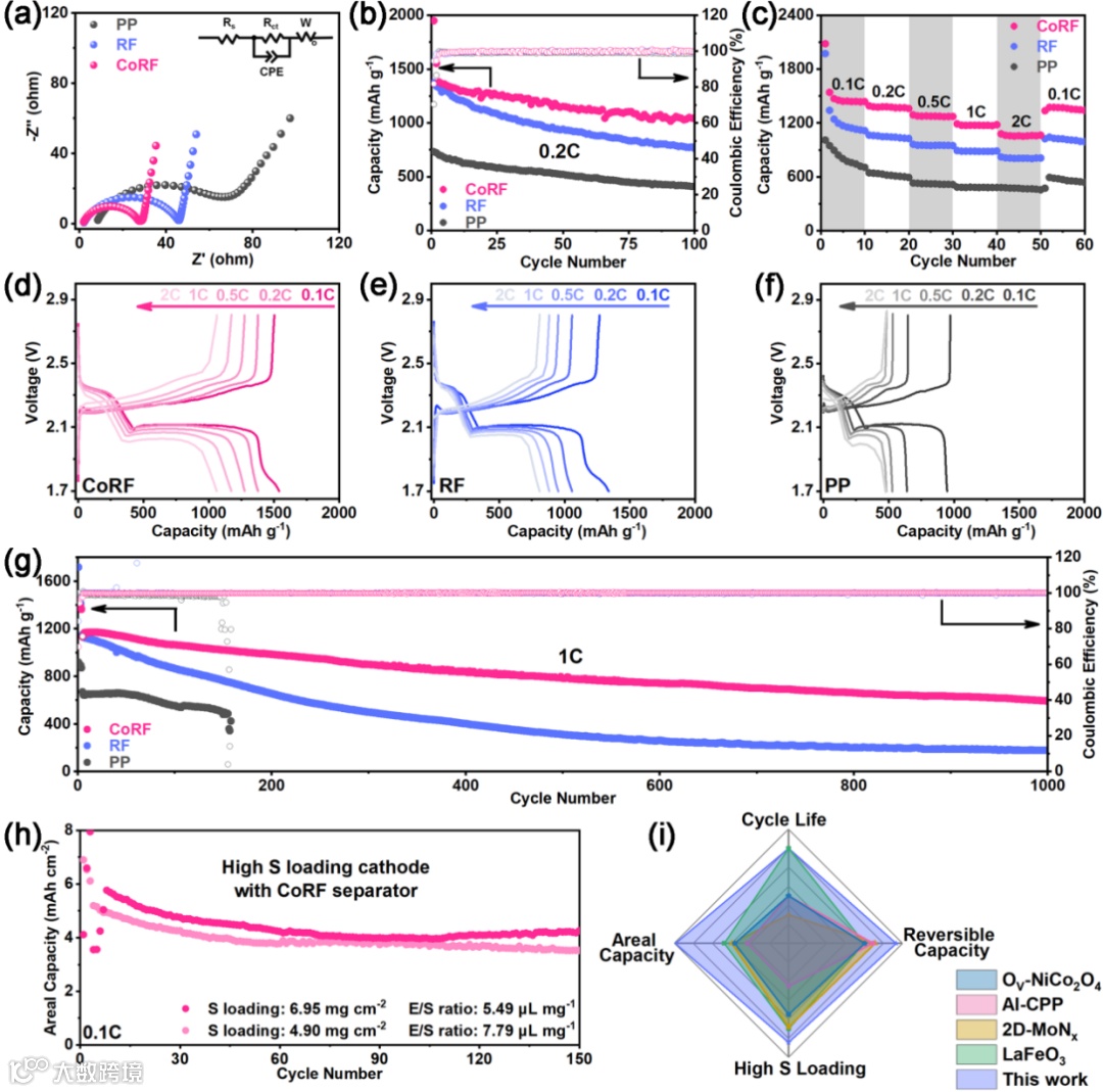 电化学测试表明,CoRF复合材料在锂硫电池中具有显著的电子传输优势和低电荷转移阻力,从而有效提升了电极反应动力学。在不同倍率条件下,CoRF电池均表现出高容量与优异的倍率性能,即使在高硫负载下亦能实现稳定循环。长期循环测试表明,CoRF可在1C高电流下实现超过1000次循环的稳定运行,容量衰减率极低。这些结果充分表明,Co的引入不仅优化了界面反应和电子传输,还保障了电池的高容量输出、长寿命和循环稳定性。
