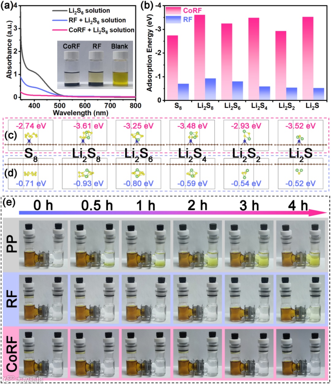 CoRF材料通过高比表面积的RF碳骨架支撑均匀分布的纳米级钴颗粒,实现了良好的离子通道和电子传导路径。同时,纳米钴颗粒在碳骨架的约束下呈现高度分散状态,提供大量催化活性位点,从而显著提升了多硫化物的吸附能力和反应动力学。CoRF复合材料表现出显著的多硫化物吸附能力,能够有效固定溶液中的Li2S6,并通过DFT计算显示其对S8及Li2Sn的吸附能明显高于RF,表明其在锂硫电池中具备优异的锚定作用。Co的引入不仅增强了材料对多硫化物的吸附,还显著加快了LPS向Li2S的转化,提高了电化学氧化和还原过程中的反应动力学。此外,CoRF具有较大的电化学活性表面积和较高的电子态密度,从而优化了电荷传输和界面反应速率,为锂硫电池的高容量输出与循环稳定性提供了有力支撑。