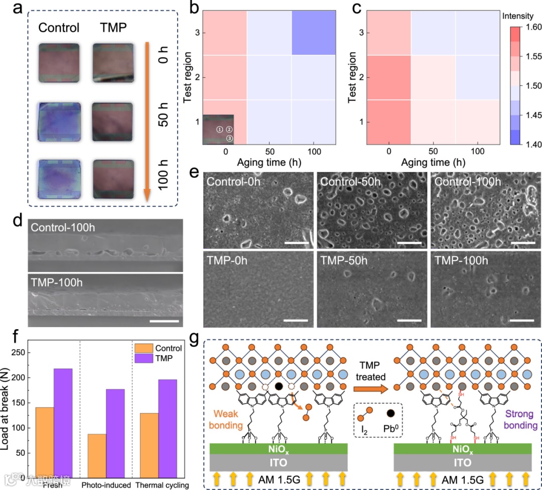 异质界面稳定性是限制钙钛矿太阳能电池长期运行的关键因素。为评估增强钙钛矿/HTL界面对薄膜稳定性的影响,在30-40%湿度空气环境中,对样品进行持续1 sun光照老化测试。老化50小时后,对照样品在玻璃侧出现明显变色,而经TMP修饰的样品几乎无可见变化,表明其具备更优异的抗光老化能力。吸收光谱测试进一步证实,随着老化时间延长,TMP处理薄膜的吸收衰减明显减缓,说明界面修饰有效抑制了钙钛矿的光诱导分解。形貌表征结果表明,对照样品在埋藏界面处出现大量孔洞并伴随严重结构破坏,而TMP处理后孔洞的形成与扩展被显著抑制。此外,界面力学测试表明,在光照老化和热循环条件下,TMP处理均能有效减缓界面结合强度的衰减。机理分析发现,TMP填补了SAM层中的空隙,减少钙钛矿与NiOx的直接接触,还通过强配位作用稳定了埋藏界面的铅卤化物结构,显著抑制了碘离子氧化和金属铅的生成。