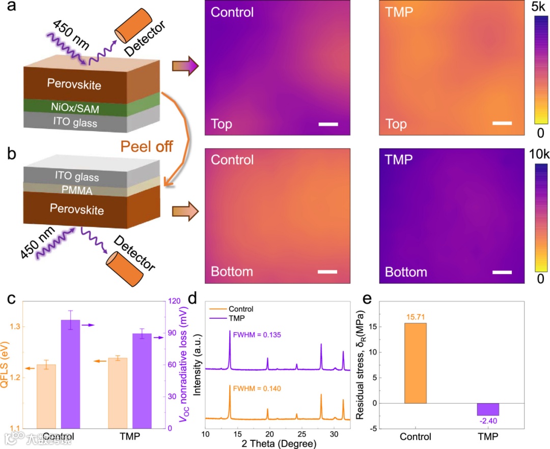 PL成像结果表明,TMP处理后,钙钛矿薄膜在顶部激发时发光减弱、底部激发时发光增强,说明空穴提取效率提高、埋藏界面非辐射复合受到有效抑制。UPS与PLQY分析进一步证实,TMP降低了能级失配,提高了准费米能级分裂,并显著减少开路电压损失。与此同时,TMP处理促进晶粒生长、降低表面粗糙度并缓解界面残余应力,使钙钛矿/传输层界面更加致密稳定,为实现高性能器件提供了有力支撑。