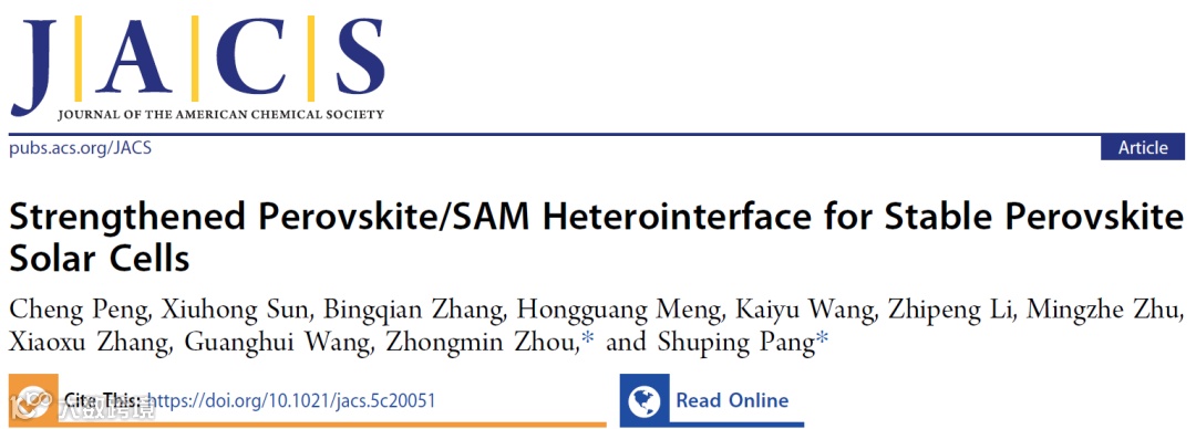 近日,来自青岛科技大学的周忠敏教授与中国科学院青岛生物能源与过程研究所的逄淑平教授合作,在国际知名期刊Journal of the American Chemical Society上发表题为“Strengthened Perovskite/SAM Heterointerface for Stable Perovskite Solar Cells”的文章。该文章提出了多硫醇交联剂策略构建稳定可靠的钙钛矿/SAM异质界面。多硫醇交联剂不仅与基底金属氧化物形成化学键,还在界面保留部分未结合的free -SH,为钙钛矿的生长和键合创造了有利环境。