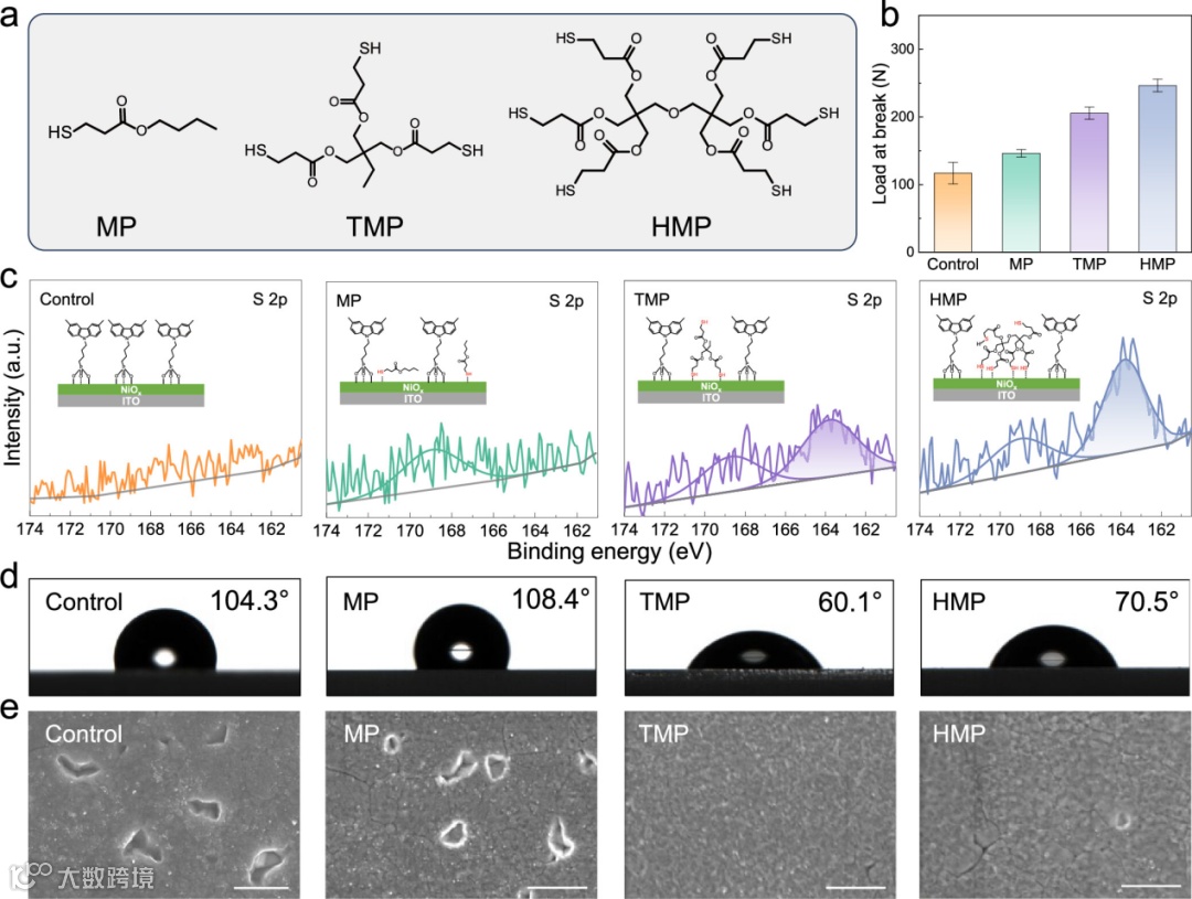在钙钛矿太阳能电池中,界面结合强度直接影响器件稳定性与性能。基于软硬酸碱(HSAB)理论,软酸与软碱之间更容易通过电子云共享形成稳定的共价作用。其中,I⁻具有极低的化学硬度,为Pb–I八面体结构的形成提供了理想环境,而-SH基团的化学硬度与I⁻接近,同样能够与Pb2+、Ni2+等软酸离子形成强相互作用。此外,硫化物具有极高的pKsp,说明硫-金属之间的成键十分稳定。实验表明,当含硫分子MP与含Pb2+、Ni2+溶液反应时,溶液迅速生成沉淀,进一步验证了其强配位能力。通过引入不同硫醇交联分子(MP、TMP、HMP)对NiOx/Me-4PACz界面进行修饰,界面键合强度显著提升。表征结果揭示了硫醇交联分子的作用机制:硫醇交联分子能够有效填充SAM未覆盖的区域;多硫醇分子不仅能与NiOx成键,还能在界面保留部分游离-SH,为钙钛矿层沉积提供结合位点;同时改善界面润湿性,促进高质量钙钛矿薄膜生长。