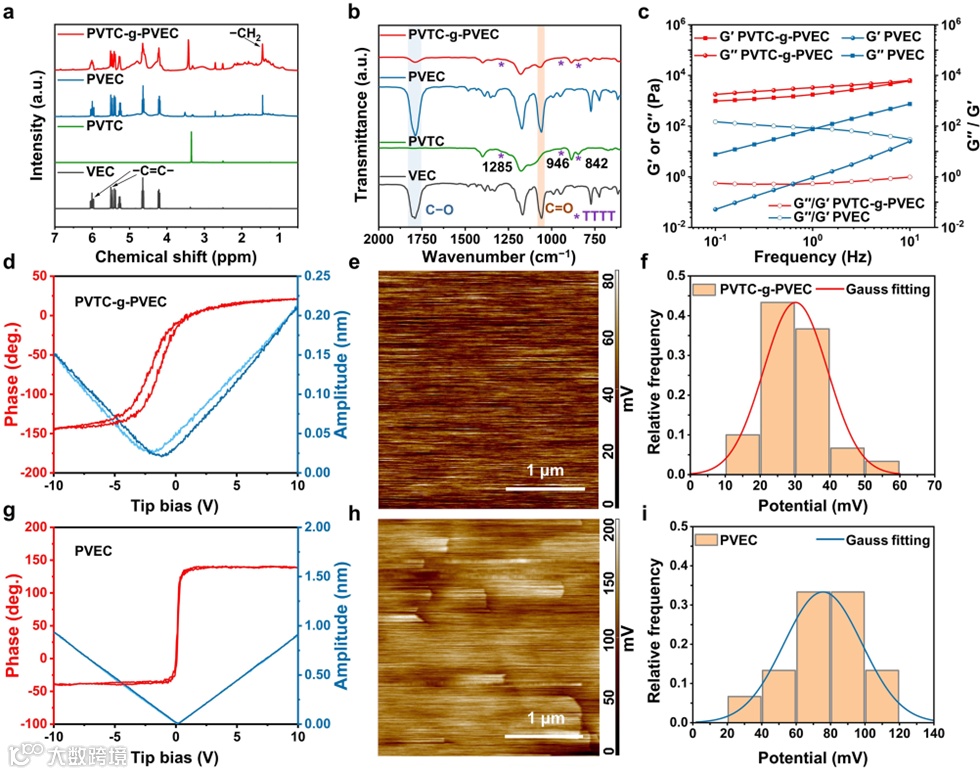 图2. PVTC-g-PVEC固态聚合物电解质的结构和铁电性能表征。a) VEC、PVTC、PVEC和PVTC-g-PVEC的1H NMR谱图;b) 上述材料的FTIR谱图;c) PVTC-g-PVEC与PVEC固态聚合物电解质的流变性能曲线。d) PVTC-g-PVEC和g) PVEC固态聚合物电解质的压电响应振幅与相位迟滞回线。e) PVTC-g-PVEC和h) PVEC固态聚合物电解质的表面电势图像。f) PVTC-g-PVEC和i) PVEC固态聚合物电解质的界面电势高斯分布直方图。