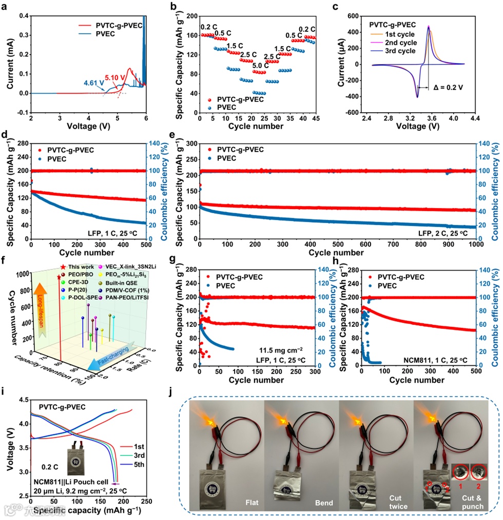 图5. 采用PVTC-g-PVEC SPE的不同电池的电化学性能。a) PVTC-g-PVEC与PVEC SPE的电化学稳定窗口。b) 采用PVTC-g-PVEC和PVEC电解质组装的LFP||Li电池的倍率性能。c) LFP|PVTC-g-PVEC|Li和LFP|PVEC|Li电池的CV曲线。LFP|PVTC-g-PVEC|Li和LFP|PVEC|Li电池在d) 1 C和e) 2 C下的长循环性能。f) 本研究的PVTC-g-PVEC SPE与文献中其他SPE在LFP||Li电池测试中的循环寿命对比。g) 采用PVTC-g-PVEC和PVEC电解质组装的高负载LFP||Li电池在1 C下的循环性能。h) NCM811|PVTC-g-PVEC|Li电池在1 C下的长循环性能。i) NCM811|PVTC-g-PVEC|Li软包电池在0.2 C下的循环稳定性。j) 软包电池在平放、弯曲、切割和针刺状态下点亮发光二极管的光学照片。