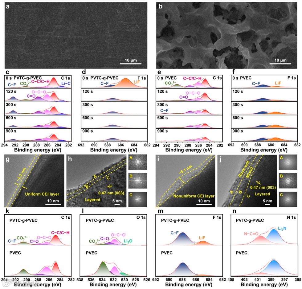 图6. 使用PVTC-g-PVEC SPE的循环后锂电极与NCM811正极界面表征。a) Li|PVTC-g-PVEC|Li和b) Li|PVEC|Li电池在25°C、0.05 mA cm−2条件下循环500小时后,锂电极表面的SEM图像。使用c, d) PVTC-g-PVEC和e, f) PVEC SPE的循环锂金属负极的XPS谱图:c, e) C 1s和d, f) F 1s。使用g, h) PVTC-g-PVEC和i, j) PVEC SPE的循环NCM正极在1 C下循环60次后的TEM及相应FFT图像。在PVTC-g-PVEC和PVEC SPE中循环60次后的NCM811正极的XPS谱图:k) C 1s、l) O 1s、m) F 1s和n) N 1s。