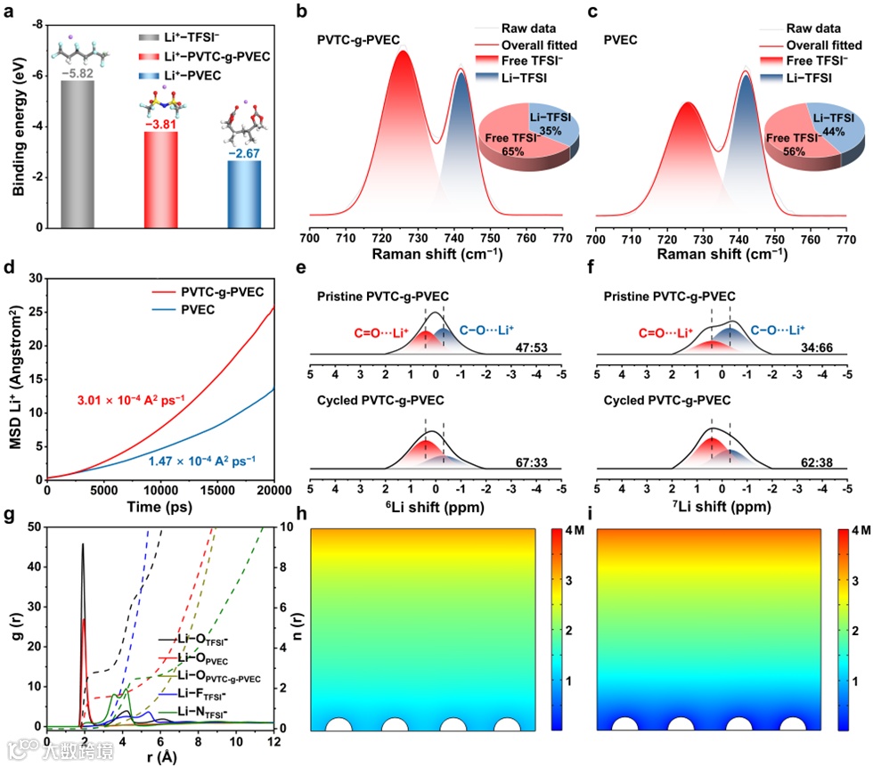 图4. PVTC-g-PVEC SPE中LiTFSI解离机理、传导机理及锂离子浓度分布模拟分析。a) TFSI⁻与Li+、PVTC-g-PVEC与Li+、以及PVEC与Li+之间的结合能。b) PVTC-g-PVEC及c) PVEC SPE的拉曼光谱以及不同电解质中TFSI⁻阴离子状态的相应定量结果。d) PVEC SPE中Li⁺的均方位移。e) PVTC-g-PVEC与f) PVEC SPE在Li||Li电池循环前后的7Li和6Li NMR谱图。g) 25℃下PVTC-g-PVEC SPE中相对于Li+的径向分布函数g(r)及配位数。h) PVTC-g-PVEC与i) PVEC SPE中Li+浓度分布的COMSOL Multiphysics模拟。