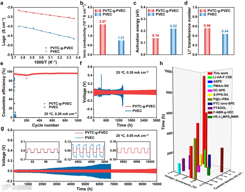 图3. PVTC-g-PVEC固态聚合物电解质在对称Li||Li和非对称Li||Cu电池中的电化学性能。a) PVTC-g-PVEC与PVEC固态聚合物电解质在不同温度下的阿伦尼乌斯曲线。b) 离子电导率、c) 计算活化能及d) Li+迁移数的对比(PVTC-g-PVEC与PVEC)。e) 采用PVTC-g-PVEC和PVEC固态聚合物电解质的Li||Cu电池的库仑效率。Li|PVTC-g-PVEC|Li和Li|PVEC|Li电池在25°C下,于f) 0.3 mA cm−2和g) 0.05 mA cm−2电流密度下的锂沉积/剥离循环电压曲线。h) Li|PVTC-g-PVEC|Li电池的循环性能与文献报道数据的对比。