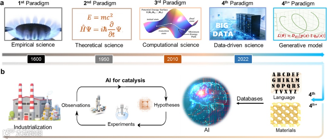 (a) 催化研究的四种范式:经验科学(第一范式)、理论科学(第二范式)、计算科学(第三范式)和数据驱动科学(第四范式);其中,生成式模型被视为第四+范式。