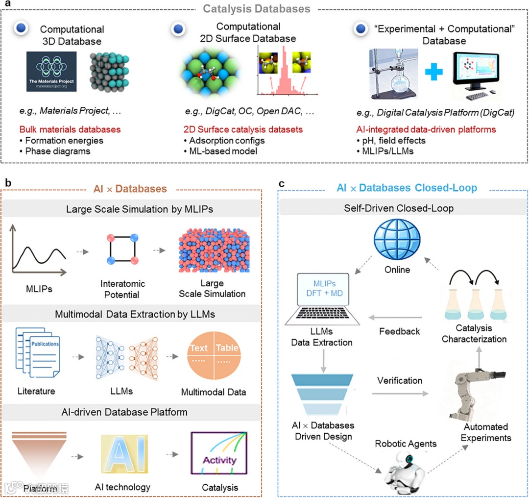 这篇文章最值得重视的地方,不在于“新概念的数量”,而在于它给出了一条层层递进、可执行、可迭代的研究路线:先解决数据底座问题,再讨论物理建模扩展能力,再引入大语言模型作为知识与流程编排层,最终落到闭环系统,并进一步走向数字材料生态。这条路径把方法论与落地路径放到同一框架中,也让 AI for Science 在催化领域从“概念讨论”走向“系统建设”。