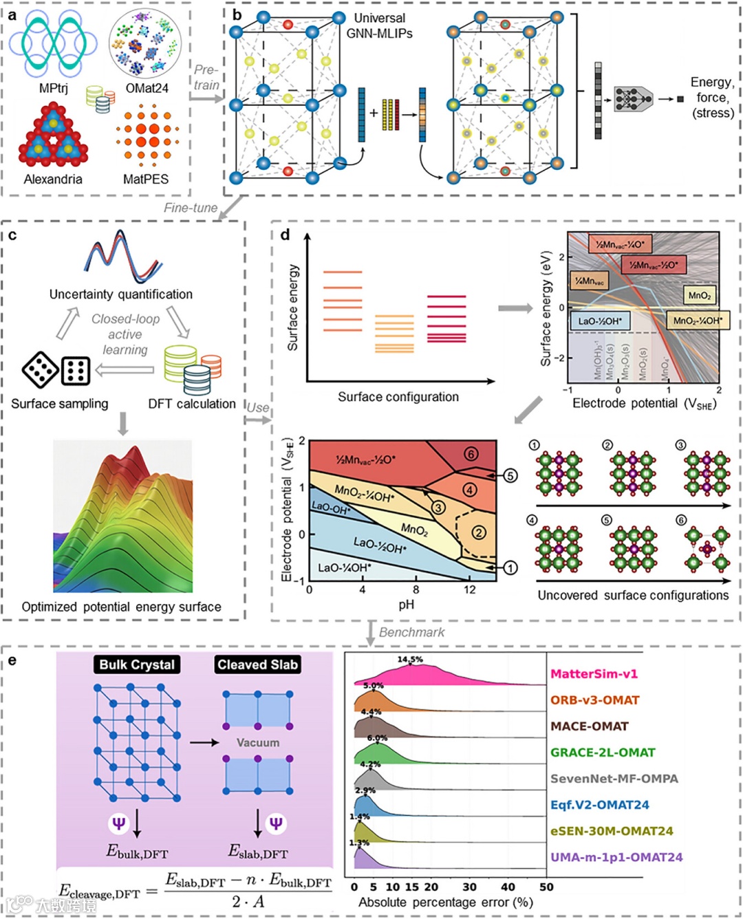 (e) 基于包含36,718个表面结构的高通量DFT数据库(覆盖单质、二元和三元金属化合物),对八种先进通用MLIP在解理能预测任务中的性能进行对比分析。