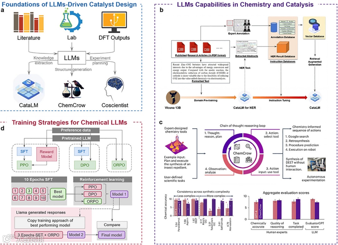 第三层是 LLM。在这篇综述的逻辑中,LLM 的定位非常清晰:它更适合承担知识组织与科研编排功能,而不是直接替代物理机制推导。它擅长文献解析、信息抽取、任务分解、流程调度和人机协同,但在反应机理、能垒差异、界面电荷与动力学竞争等关键问题上,仍需物理模型与实验事实共同约束。这样的定位既肯定了 LLM 的现实价值,也避免了“万能化”叙事。它提示我们,未来高效研发并非“单模型独立完成”,而是多工具协同:MLIP 提供物理可计算能力,LLM 提供知识与流程组织能力。
