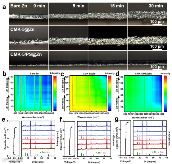 原位表征进一步揭示了 CMK-5/PS 界面层对锌沉积行为的调控机制。原位光学显微镜显示,在沉积过程中CMK-5/PS@Zn 始终保持平整表面,锌主要在碳基质孔隙内定向生长。原位 FTIR 表明,CMK-5/PS 可在镀覆过程中加速活性水和 SO42- 的去除,促进 Zn2+ 去溶剂化并实现更均匀的成核。模拟原位 XRD 进一步证实,CMK-5/PS 上锌的沉积与剥离高度可逆。CMK-5/PS 界面层通过多通道碳基质提供电子传输通道,并借助 Janus 磺酸根修饰表面引导 Zn2+ 在孔隙内受限、定向沉积,从而显著抑制枝晶生长和寄生反应。